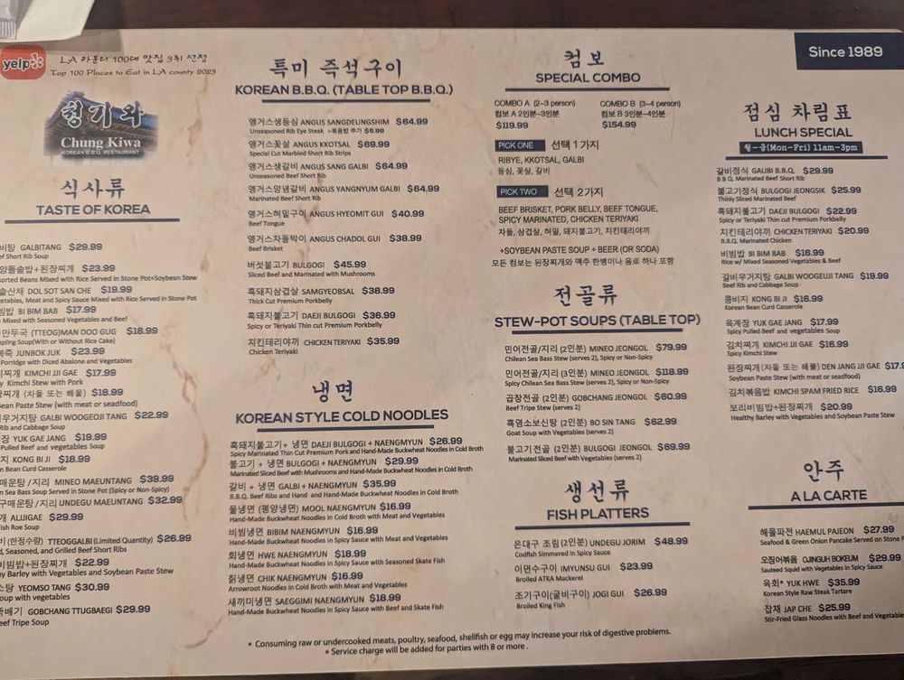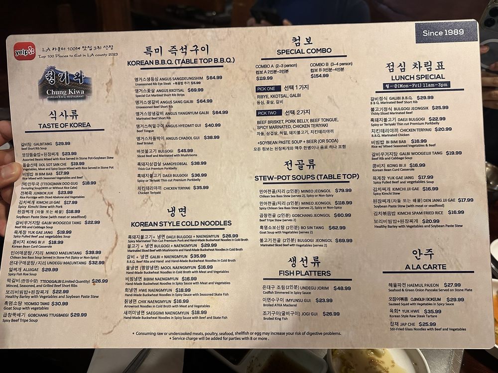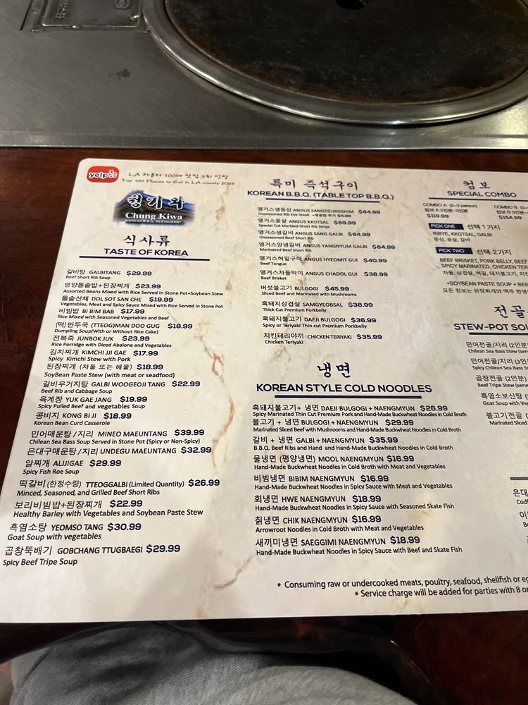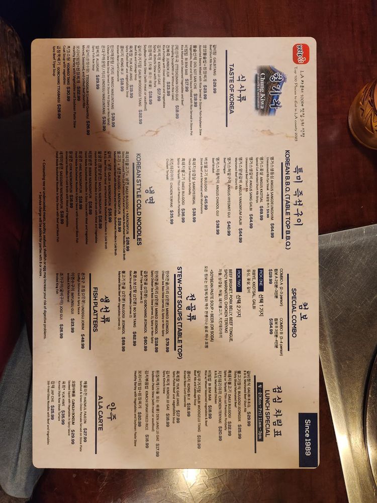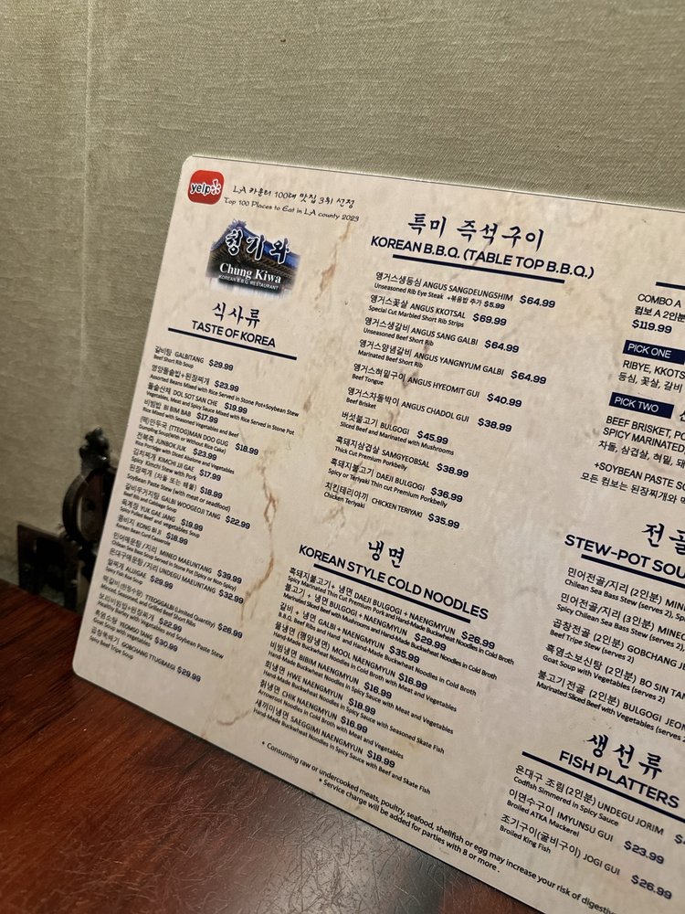 Chung Ki Wa in Los Angeles is a hidden gem in Koreatown, offering a wide range of authentic Korean BBQ dishes. Known for its great service and friendly staff, customers rave about the traditional flavors and generous portions served. Standout menu items include Mul Naengmyun, Gal Bi BBQ, and Mineo Maeun Tang soup. With ample parking options, free Wi-Fi, and a casual atmosphere, Chung Ki Wa is ideal for groups, families, and friends looking for a delicious and satisfying dining experience. The reviews highlight the exceptional quality of the food, with many customers praising the flavorful meats and unbeatable taste. Don't miss out on the opportunity to savor the best Korean cuisine in LA at Chung Ki Wa.